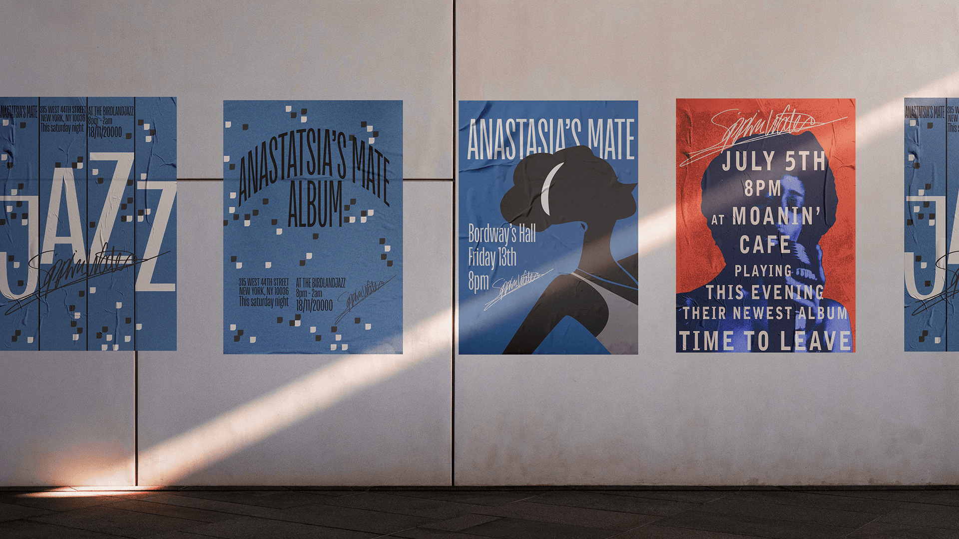 Ce projet consistait à créer une identité visuelle complète et un univers artistique pour Sippin’ Water, un groupe de musique de jazz. L’objectif était de respecter les codes esthétiques du jazz – élégance, rythme, sophistication – tout en y intégrant une touche de modernité pour séduire un public plus large et actuel.